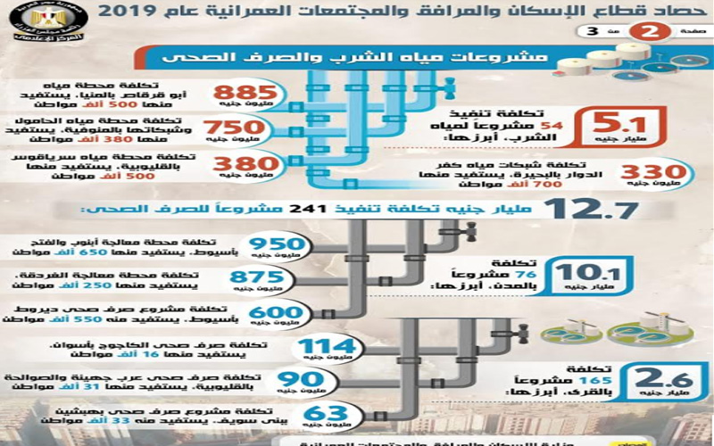 وبشأن مشروعات مياه الشرب والصرف الصحي المنفذة على مدار عام 2019، كشف الإنفوجراف، أنه تم تنفيذ 54 مشروعًا لمياه الشرب بتكلفة 5.1 مليار جنيه أبرزها، إنشاء محطة مياه أبوقرقاص بالمنيا بتكلفة 885 مليون جنيه، ليستفيد منها 500 ألف مواطن، بالإضافة إلى تنفيذ محطة مياه الحامول وشبكاتها بالمنوفية ليستفيد منها 380 ألف مواطن بتكلفة 750 مليون جنيه، بجانب إنشاء محطة مياه سرياقوس بالقليوبية بتكلفة 380 مليون جنيه ليستفيد منها 500 ألف مواطن، وكذلك تم إنشاء شبكات مياه كفر الدوار بالبحيرة بتكلفة 330 مليون جنيه، ليستفيد منها 700 ألف مواطن.