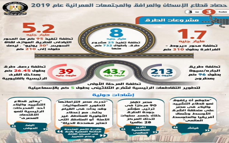 وفي هذا الصدد، نشر المركز الإعلامي لمجلس الوزراء، إنفوجرافًا كشف من خلاله عن أهم الإنجازات في قطاع الإسكان والمرافق والمجتمعات العمرانية، على مدار عام 2019.