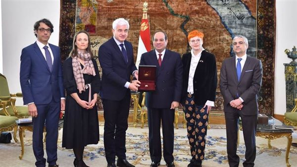 من جانبه؛ رحب السيد الرئيس بأعضاء الوفد الألماني في مصر، معرباً سيادته عن التقدير لاختياره لتقلد وسام "سان جورج"، ومؤكداً أن هذا الاختيار إنما يعبر عن مدى التقارب والتطور الذي شهدته العلاقات بين مصر وألمانيا خلال السنوات الأخيرة على كافة الأصعدة، إلى جانب كونه شاهداً على ما حققته مصر مؤخراً من استقرار وبناء في مختلف المجالات، خاصةً في مجالات الفن والثقافة التي تساهم بشكل مباشر في بناء الإنسان والتقارب فيما بين الشعوب.