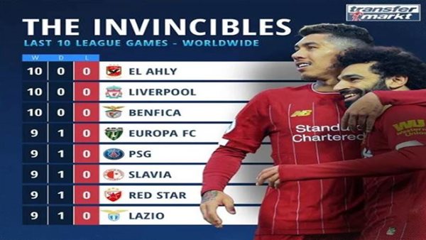 تصدر النادي الأهلي المصري قائمة الأندية التي لم تخسر هذا الموسم في بطولة الدوري، متساويًا مع كل من ليفربول الإنجليزي وبنفيكا البرتغالي.