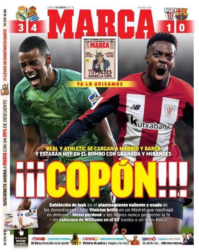 دونت صحيفة "ماركا": كأس عظيم.. بيلباو وسوسيداد يهزمان برشلونة وريال مدريد ويتأهلان إلى نصف نهائي الكأس.