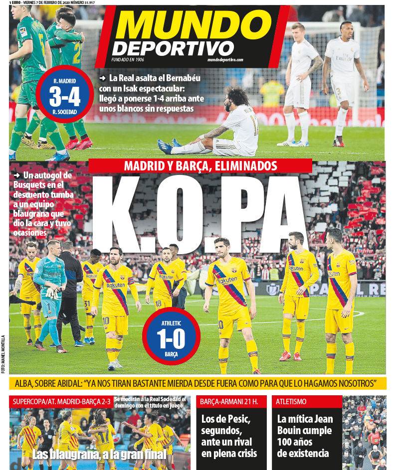 ورصدت صحيفة "موندو ديبورتيفو": مدريد وبرشلونة خارج الكوبا..هدف بوسكيتس "العكسي" يطيح ببرشلونة من الكأس رغم تقديم مباراة جيدة في سان ماميس وإيزاك نجم سوسيداد يقود فريقه للتقدم 4-1 على الريال فى البرنابيو.