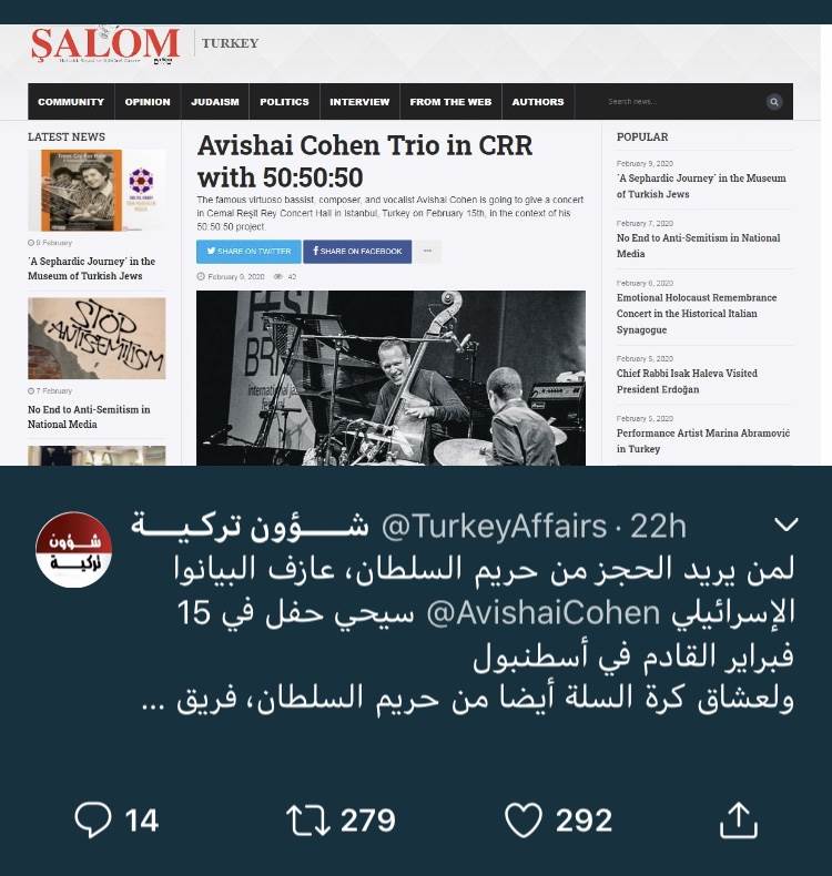 أشار موقع شؤون تركية إلى صحفية تركية تعلنعن حفل غنائي لمطربإسرائيلي،15 فبراير القادم،بالإضافة إلى تواجد فريق كرة السلة الإسرائيلي الآن بإسطنبول.