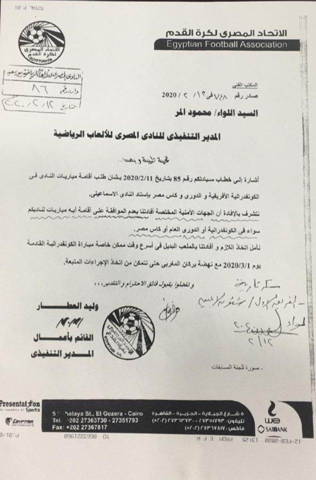 وطالب اتحاد الكرة - في خطابه - النادي المصري بتحديد ملعب بديل في أسرع وقت ممكن لاستضافة مباراته أمام فريق نهضة بركان المغربي في ذهاب الدور ربع النهائي للبطولة الكونفدرالية، والمقرر إقامتها في الأول من مارس القادم.