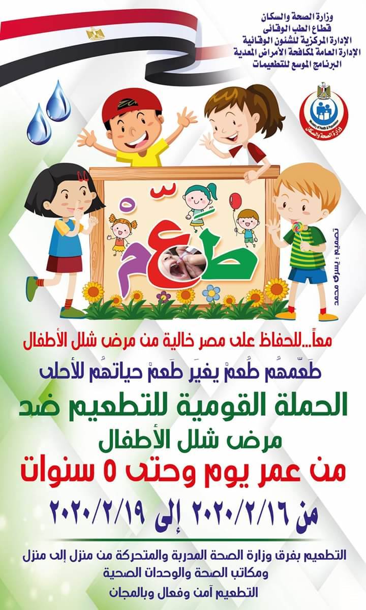 قال الدكتور هشام شوقي مسعود، وكيل وزارة الصحة بالشرقية، إنه تم الانتهاء من الاستعدادات الخاصة بالحملة القومية للتطعيم ضد مرض شلل الأطفال للمصريين وغير المصريين، المقيمين بمحافظة الشرقية من عمر يوم وحتى ٥ سنوات بالمجان، والتي سيتم تنفيذها لمدة ٤ أيام، بدءا من الأحد الموافق ١٦ فبراير وحتي الأربعاء ١٩ فبراير.