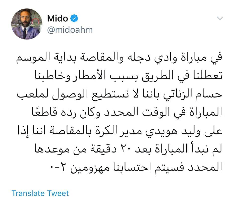 وكتب ميدو، عبر حسابه الشخصي على موقع التواصل الاجتماعي "تويتر": "في مباراة وادي دجلة والمقاصة بداية الموسم تعطلنا في الطريق بسبب الأمطار وخاطبنا حسام الزناتي بأننا لا نستطيع الوصول لملعب المباراة في الوقت المحدد".