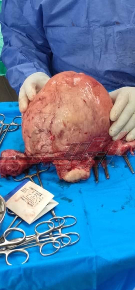 وتمكن الفريق الطبي المكون أ.د. خميس الخطيب، استشاري التخدير، و د. كريم الخطيب، رئيس قسم الجراحة، و د. حنفي خروب، أخصائي الجراحة، ومن قسم النساء والتوليد د. يمان اأبوكبشه استشاري النساء والتوليد، د. صفاء عبدالواحد، أخصائي النساء والتوليد، د. محمد سلامة، رئيس القسم، وتم مناظرة الحالة وعمل فحوصات كاملة وعرضها علي رئيس قسم الباطنة د. رمضان العطار، ورئيس قسم العناية المركزة د. محمد سمير، وتم استئصال ورم سرطاني بالرحم (uterine sarcoma) واستئصال كامل للرحم، والمريضة بحالة صحية جيدة.