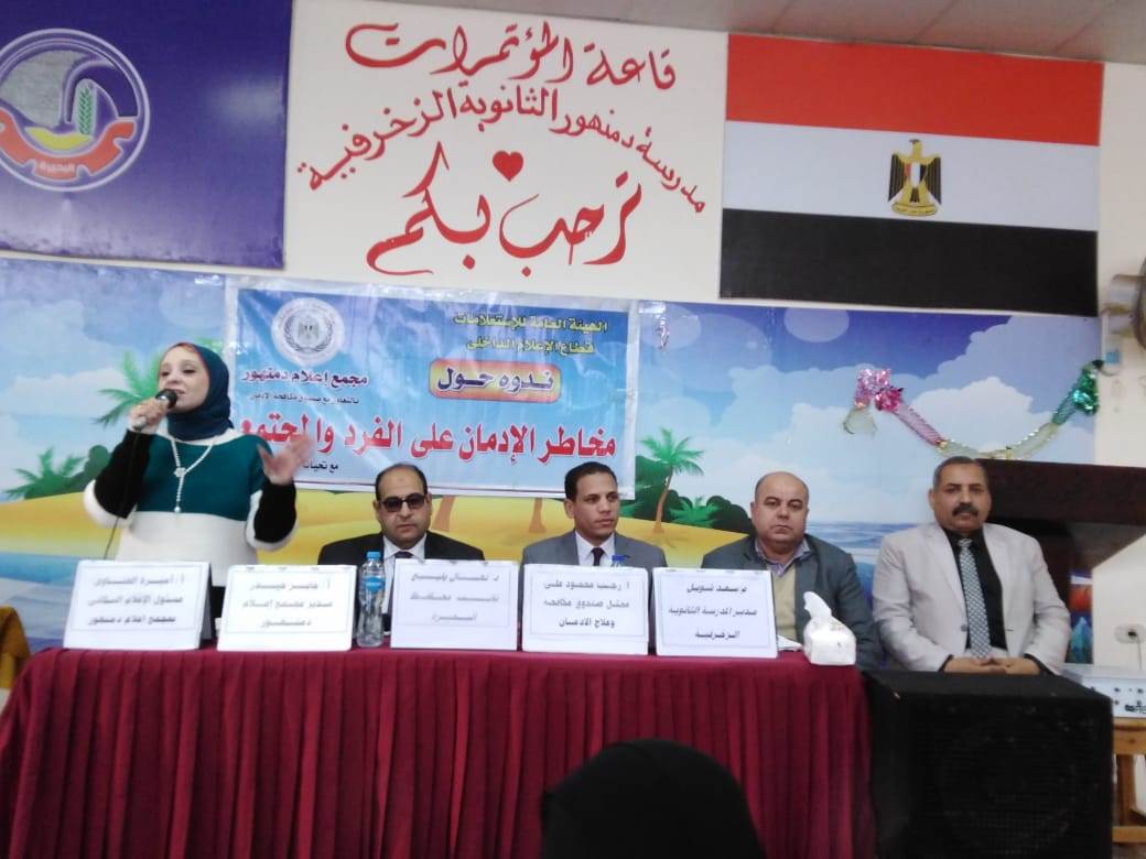 نظم مجمع اعلام دمنهور، ندوة حول مخاطر الادمان على الفرد والمجتمع وذلك بالتعاون مع صندوق مكافحة وعلاج الادمان تحت رعاية السيد اللواء هشام آمنه محافظ البحيرة ، بمدرسة دمنهور الثانوية الزخرفية بنين .