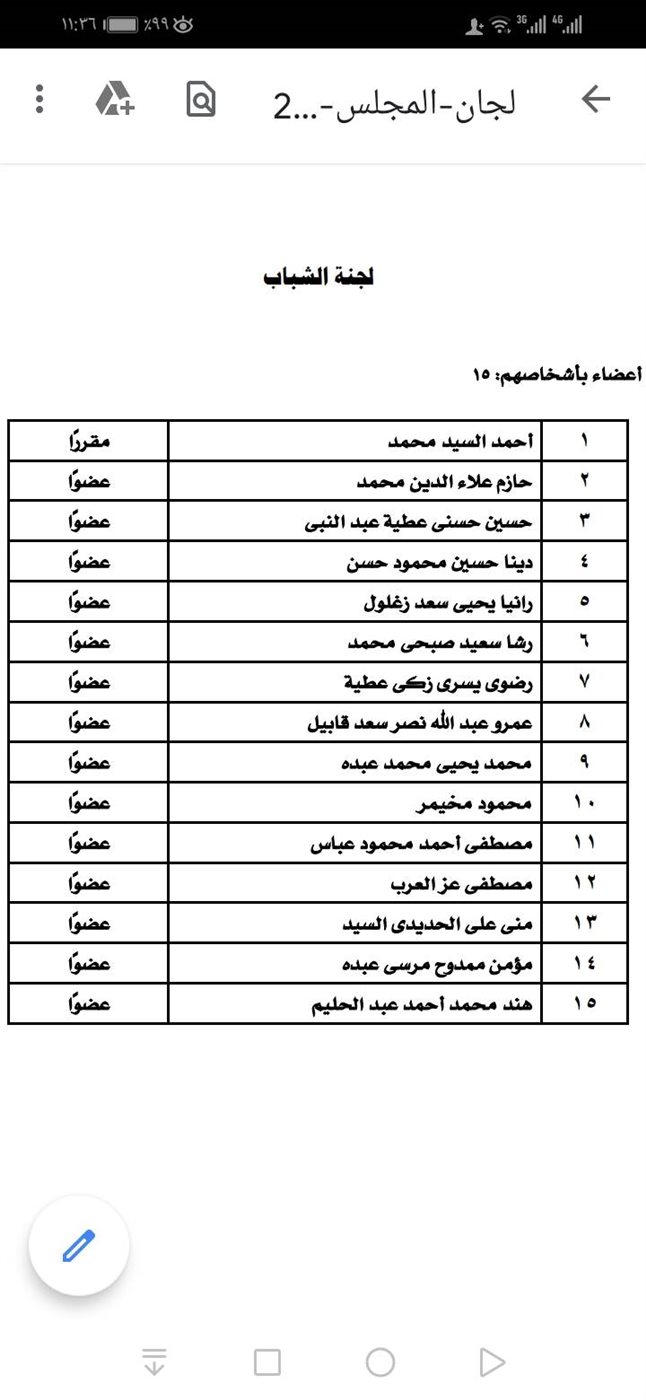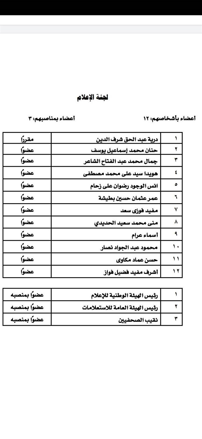بينما يبلغ عدد الأعضاء في كل لجنة خمسة عشر عضوا روعي في اختيارهم معايير الكفاءة والخبرة والالتزام، كما روعي التمثيل الجيد لكل من الشباب والمرأة.
