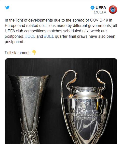 واختتم: "نتيجة للتأجيلات، تم تأجيل أيضًا قرعة ربع نهائي دوري أبطال أوروبا والدوري الأوروبي المقرر في 20 مارس."