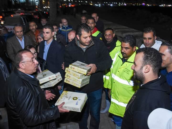 قام اللواء محمد الشريف محافظ الإسكندرية، مساء اليوم، بتوزيع ١٢٠٠ وجبة علي عمال شركة الصرف الصحي والنظافة والأحياء وعمال شركات المرافق المتواجدين فى الشارع للعمل وسط الطقس السيء الذي تشهده المحافظة.