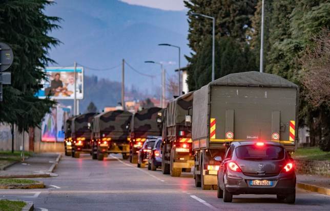 وأظهرت مقاطع "فيديو" من بيرغامو، شمال شرق ميلانو، قافلة من الشاحنات العسكرية تسير في الشوارع بين عشية وضحاها بعد إزالة التوابيت من مقبرة البلدة. وأكد متحدث باسم الجيش نشر 15 شاحنة و50 جنديًا لنقل الجثث إلى الأقاليم المجاورة. وناشدت السلطات المحلية في برغامو المساعدة في حرق الجثث بعد أن طغت على محرقة الجثث.
