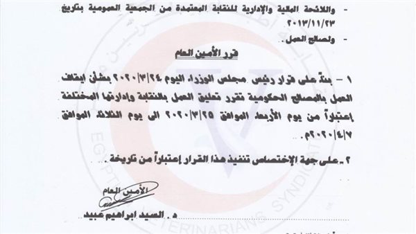 أصدر الدكتور السيد عبيد، الأمين العام للنقابة العامة للأطباء البيطريين، قرارًا إداريًا بوقف العمل بالنقابة لمدة أسبوعين، اعتبارًا من غدٍ الأربعاء ٢٥ مارس الجاري وحتى ٧ إبريل المقبل.