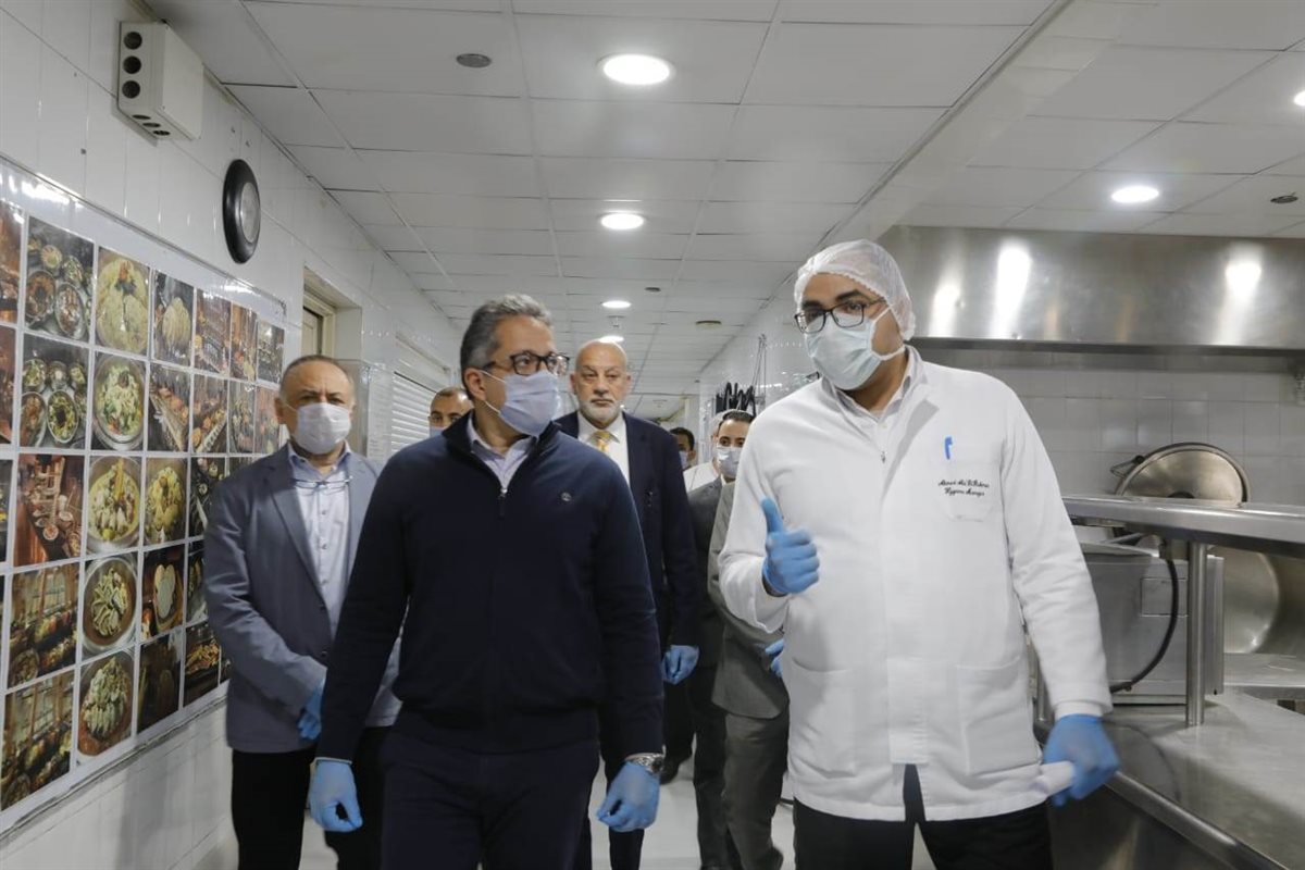 وقام الوزير بتفقد الإجراءات الوقائية التي يتبعها الفندق منذ دخول البهو ومنطقة المطاعم والبرجولا وحمامات السباحة، و الممرات الداخلية للفنادق و غرف الضيوف، كما تفقد أعمال تطهير وتعقيم المطابخ، حيث استمع الوزير من الطبيب المقيم في الفندق والمتخصص في الميكروبولوجى، الي شرح مفصل عن كافة الإجراءات الوقاية المتبعة والذي أكد ايضا على أن إجراءات التعقيم تتم وفقا للمعايير التي اقرتها منظمة الصحة العالمية ووفقا للمواد التي اقرتها وزارة الصحة والسكان، وإن أعمال التطهير تتم بصفة مستمرة.