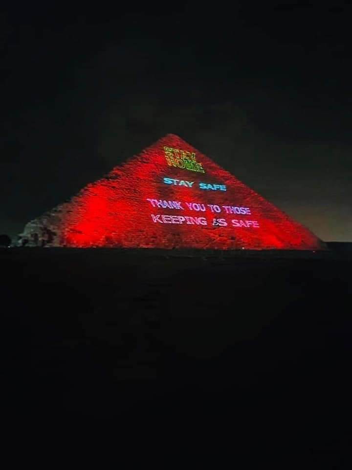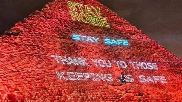 في لفتة تظهر امتنان الدولة، لما يقوم به رجال الجيش الأبيض، والطواقم الطبية فى مكافحة فيروس "كورونا"، قامت وزارة الآثار بإضاءة أهرامات الجيزة، وتحمل عبارات شكر إلى الطواقم الطبية، ومطالبة المواطنين بالبقاء في المنازل.