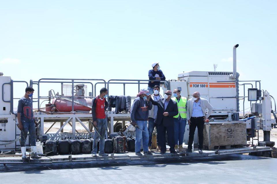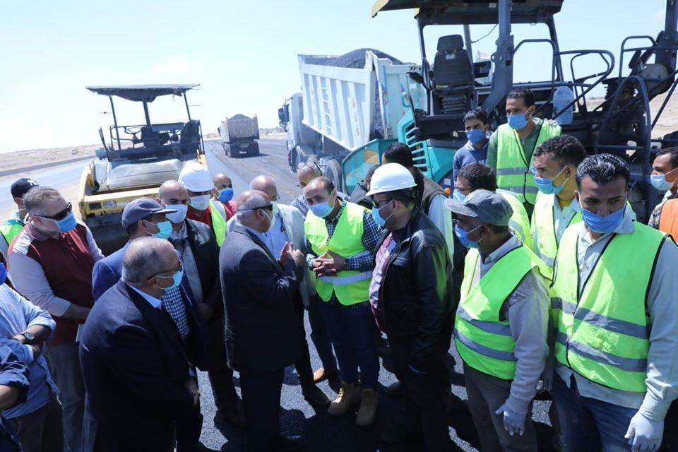 ثم تفقد الوزير بعد ذلك قطاعات المشروع المختلفة حيث تم تقسيم المشروع إلى ١١ قطاعاً لسرعة الإنجاز، وأكد ضرورة مراعاة المواصفات القياسية في تنفيذ الأعمال والاهتمام بالعواكس والتخطيط بالبويات المعاكسة واللوحات الإرشادية وعدم إقامة أي مطبات على الطريق، وعدم نقل الحركة على طريق الخدمة إلا بعد انتهاء قطاع الرصف التصميمي بالكامل واستلامه طبقاً للمواصفات القياسية، لزيادة عوامل السلامة والأمان بالطريق. ووجه الوزير باستمرار اتخاذ الإجراءات الاحترازية اللازمة لمواجهة فيروس كورونا المستجد من حيث التعقيم والتطهير المستمر لمواقع العمل والكشف على العمال والمهندسين في مختلف المواقع صباحاً وبعد انتهاء مدة العمل اليومي بالكاشف الحراري، مع ضرورة الالتزام بتوزيع الكمامات والمطهرات عليهم بمواقع العمل والتأكيد على ارتداء الكمامات ووضع المطهرات في أماكن تجمع العاملين والفنيين ومكاتب المهندسين ومديري المشروعات ودورات المياه، وتوزيع المطهرات الشخصية والكحول والمنظفات لكل عامل على نفقة الشركات، وصرف مهمات الوقاية والأمن الصناعى للعمال على نفقة الشركات، كما وجه بتطهير وتعقيم حافلات نقل الركاب، وزيادة عدد رحلات نقل الركاب مع تقليل العدد الذي يتم نقله في كل رحلة.