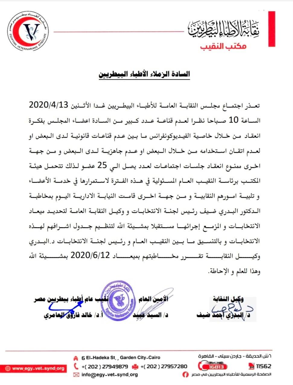 "البيطريين" تحدد 12 يونيو لانتخابات التجديد النصفي