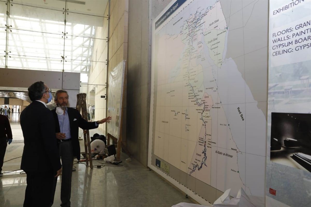 كما تفقد التجهيزات الخاصة باللوحات الإرشادية، التي توضح الجدول الزمني للحقب التاريخية المختلفة منذ فترة ما قبل التاريخ وحتى العصر المعاصر، وأيضا الخريطة التي توضح جميع المتاحف والمواقع الأثرية والسياحية في جمهورية مصر العربية؛ باللغتين العربية والإنجليزية ليتم عرضهم ضمن سياق العرض المتحفي.