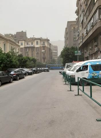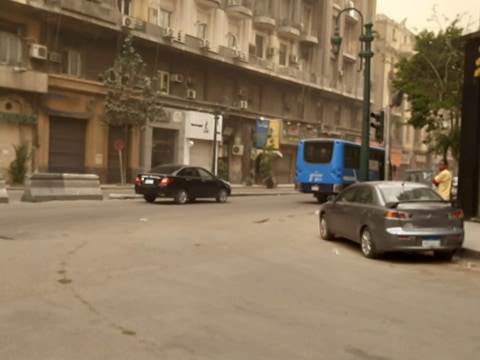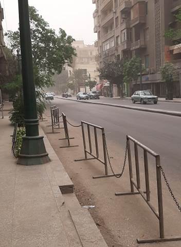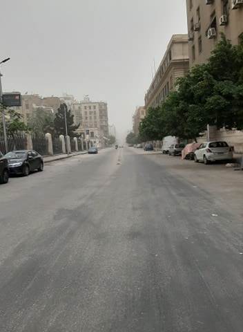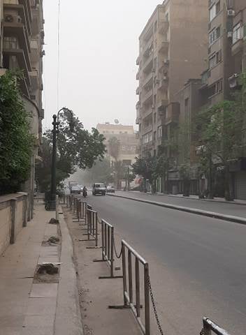 شوارع القاهرة، بدت شبه خالية من المارة، مع بدء العاصفة، وارتدى المارة الكمامات للحماية من فيروس كورونا والرياح المحملة بالأتربة، وأغلقت المحال التجارية أبوابها.