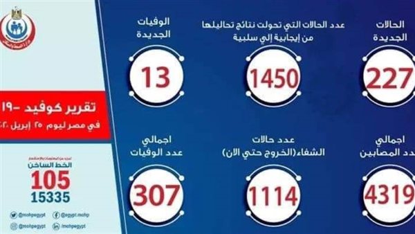 وذكر أن إجمالي العدد الذي تم تسجيله في مصر بفيروس كورونا المستجد حتى اليوم، السبت، هو 4319 حالة من بينهم 1114 حالة تم شفاؤها وخرجت من مستشفيات العزل، و 307 حالات وفاة.