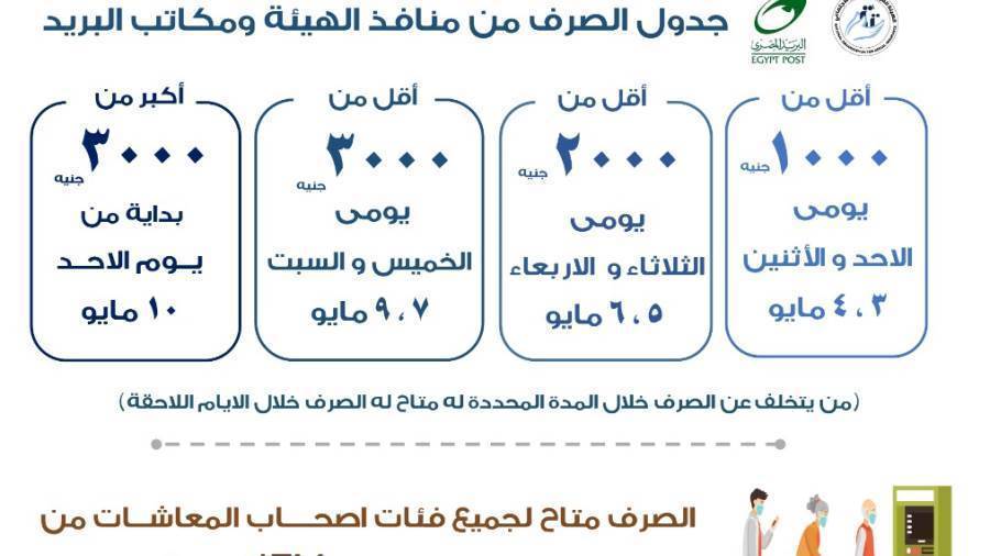 - أصحاب المعاشات الذين يتقاضون 1000 جنيه فأقل، ويبلغ عددهم 2.4 مليون قائم بالصرف، سيقومون بالصرف من منافذ الهيئة القومية للتأمينات ومكاتب البريد خلال أيام الأحد والاثنين (3-4) من شهر مايو.