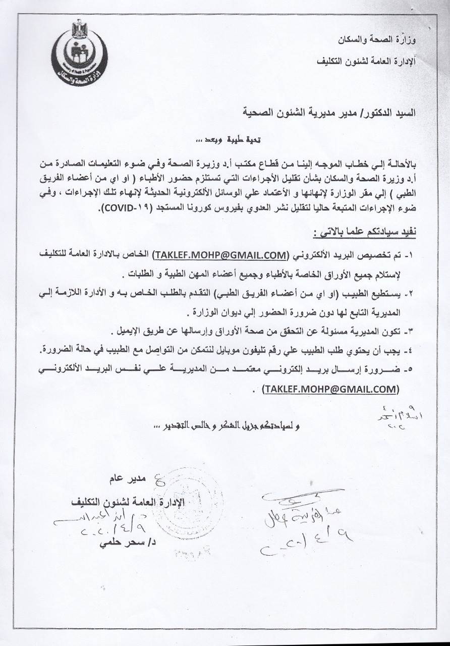 فأرسلت د. سحر حلمي، مدير عام إدارة التكليف، خطابا للنقابة بأن الوزارة، أرسلت تعليمات بذلك لجميع مديريات الشؤون الصحية بالمحافظات، وبالتالي يستطيع الطبيب إنهاء معاملاته بالمديرية، التي يعمل بها على أن تقوم المديرية، بإرسال الأوراق لإدارة التكليف بالوزارة عن طريق البريد الإلكتروني.