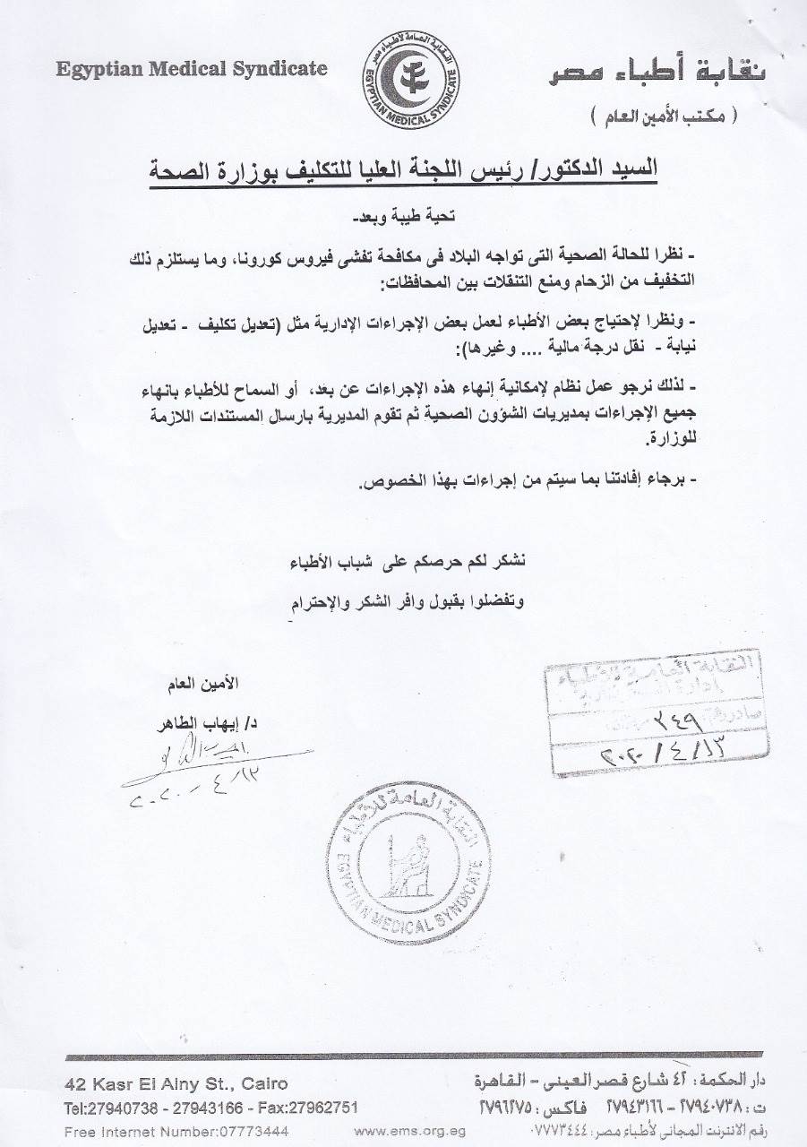 كانت نقابة الأطباء، خاطبت الوزارة للسماح للأطباء بإنهاء الإجراءات الإدارية للأطباء، “تعديل تكليف– تعديل نيابة– نقل درجة مالية.. وغيرها” عن طريق مديريات الشؤون الصحية بالمحافظات، دون الحضور لمقر الوزارة في القاهرة.