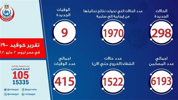 وذكر أن إجمالي العدد الذي تم تسجيله في مصر بفيروس كورونا المستجد حتى اليوم، السبت، هو 6193 حالة من ضمنهم 1522 حالة تم شفاؤها وخرجت من مستشفيات العزل والحجر الصحي، و 415 حالة وفاة.