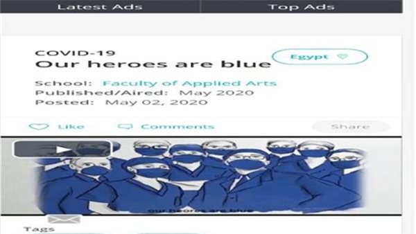 "فيه ناس بتحارب عشانك"، ساعدهم بالتزامك.. فيلم تسجيلى عن الجيش الأبيض، المتواجدين في الصفوف الأولى، لمواجهة جائحة فيروس "كورونا" المستجد، هو مشروع لمجموعة من طلبة الفرقة الثالثة بقسم الإعلان بكلية الفنون التطبيقية جامعة حلوان، لكنه حقق انتشارًا واسعًا مؤخرًا، حيث تم رفع الفيلم على موقع المؤسسة الدولية للإعلان Ads of the World، وهي تعد أكبر أرشيف دولي لتوثيق الإعلانات على مستوى العالم، منذ إنشائها عام ٢٠٠٥، وتحقق نسبة مشاهدة ٨٤٨.٨٨٢ ألف زائر شهريًا، وتنشر المؤسسة مجالات الإعلان كافة، سواء المطبوعة أو الإعلانات الخارجية والإعلان المحيط وإعلانات الإنترنت من جميع أنحاء العالم.