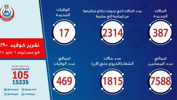 وبلغ إجمالي العدد الذي تم تسجيله في مصر بفيروس كورونا المستجد حتى اليوم، الأربعاء، 7588 حالة، من ضمنهم 1815 حالة تم شفاؤها وخرجت من مستشفيات العزل والحجر الصحي، و469 حالة وفاة.