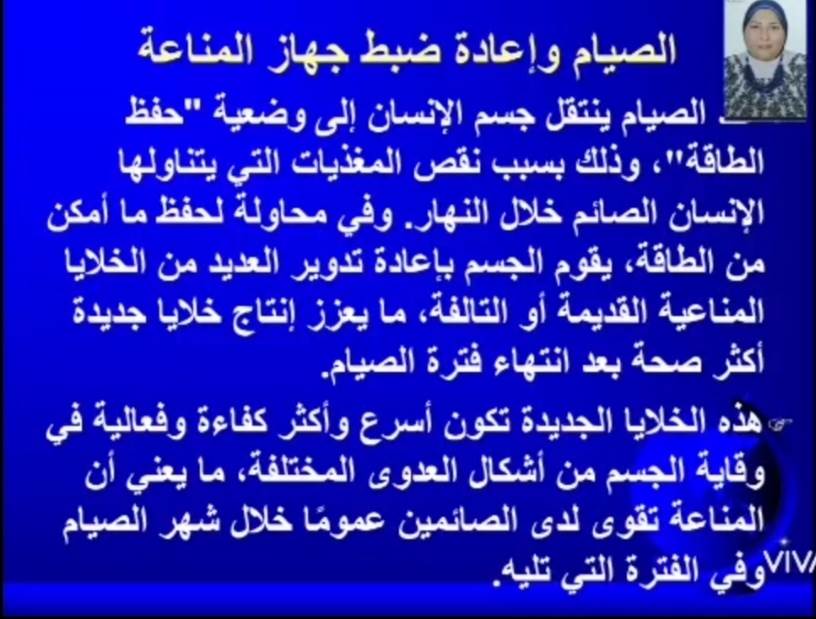 أوضحت د. صفاء صلاح، أن كلية التمريض تقوم بحملة توعوية تقدم من خلالها نصائح توعوية تخدم صحة الفرد والمجتمع، خلال شهر رمضان المبارك، وأضافت أن نصيحة اليوم عن أهمية الصيام، ودوره في رفع المناعة تقدمها د. جيهان مصطفى، رئيس قسم إدارة التمريض والقائم بعمل عميد الكلية السابق، ومن هذه النصائح: