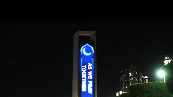 ورسمت الأضواء صورة لشعار اللجنة العليا للأخوة الإنسانية، وهاشتاج 14 مايو "صلاة من أجل الإنسانية" أعقبهم " هيا نصلي معا" بكلا اللغتين العربية والإنجليزية، للفت أنظار المواطنين والمقييمن، استعدادا لبدء الدعاء والصلاة من أجل أن يرفع الله البلاء والوباء عن البشرية.