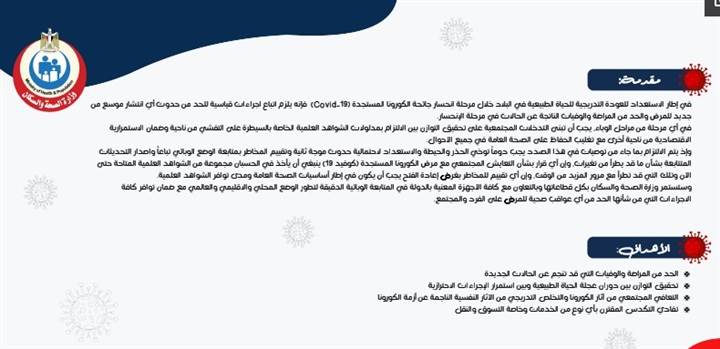 نشرت وزارة الصحة والسكان، على موقعها الإلكتروني، الخطة الكاملة للتعايش مع فيروس «كورونا» المستجد (كوفيد 19)، وأهابت بالمواطنين بضرورة ارتداء الكمامة أثناء الخروج من المنزل، مع استمرار ذلك حتى إشعار آخر.