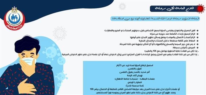 6- المريض بأعراض بسيطة: إذا كان من الفئات عالية الخطورة يتواصل مع 105 والطبيب.. وإذا كان من غير تلك الفئات يبقى في المنزل ويتبع إرشادات العزل المنزلي لحين زوال الأعراض تمامًا أو أي علامة تدل على تطور الأعراض المرضية، وتشمل استمرار ارتفاع الحرارة لمدة تزيد عن 3 أيام، وضيق في التنفس، وألم شديد بالصدر يعيق التنفس، ونهجان أثناء الراحة، وعلامات الجفاف، وتشنجات (خاصة الأطفال)، واضطراب الوعي، كحة مدممة (نادرا)، أو علامات أخرى تدل على شدة المرض بعد مراجعة الشخص القائم بالمتابعة أو الاتصال برقم 105، وعند ظهور أي من تلك الأعراض يدل ذلك على تطور المرض ويتوجه فورا للمستشفى.