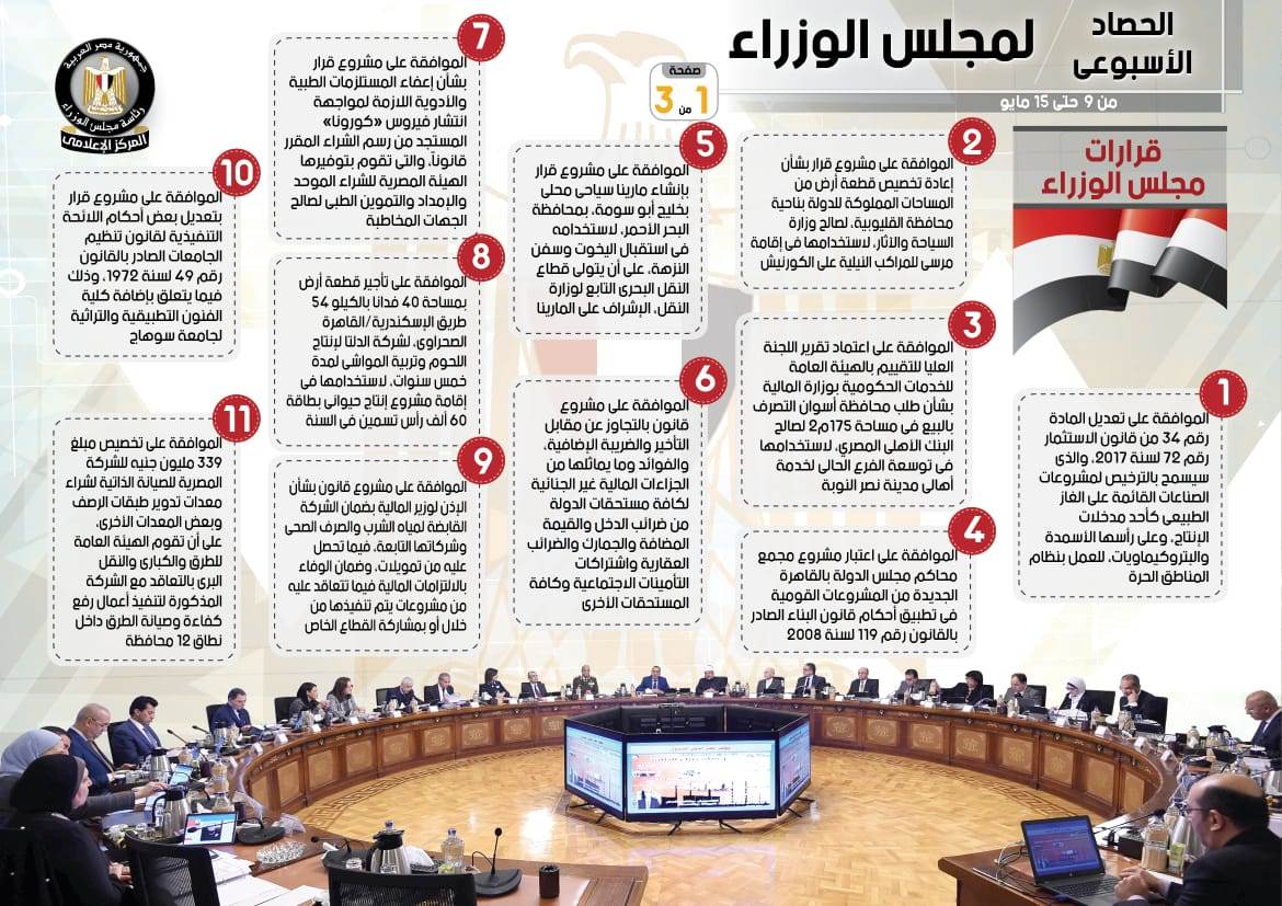 نشر المركز الإعلامي لمجلس الوزراء، إنفوجرافاً سلط من خلاله الضوء على الحصاد الأسبوعي لمجلس الوزراء، وذلك خلال الفترة من 9 حتى 15 مايو 2020، والذي تضمن الموافقة على عدد من القرارات، فضلاً عن الاجتماعات واللقاءات التي عقدها الدكتور مصطفى مدبولي، رئيس مجلس الوزراء، بالإضافة إلى ما قام به من أنشطة.