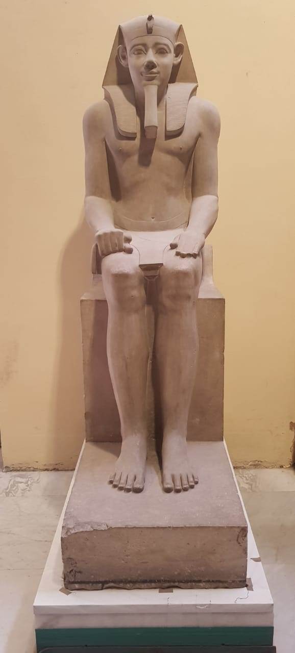 و أوضح الدكتور الطيب عباس مدير عام الشؤون الأثرية بالمتحف المصري الكبير أن مجموعة تماثيل الملك سنوسرت الأول قد تم الكشف عنها عام ١٨٩٤ داخل حفرة في المعبد الجنائزي للمجموعة الهرمية للملك سنوسرت الأول بمنطقة اللشت بالفيوم وهي مصنوعة من الحجر الجيرى و تم نقلها إلى المتحف المصري بالتحرير عام ١٨٩٥. تصور هذه المجموعة الملك سنوسرت الأول في مرحلة الشباب و هو جالسا علي كرسي العرش.