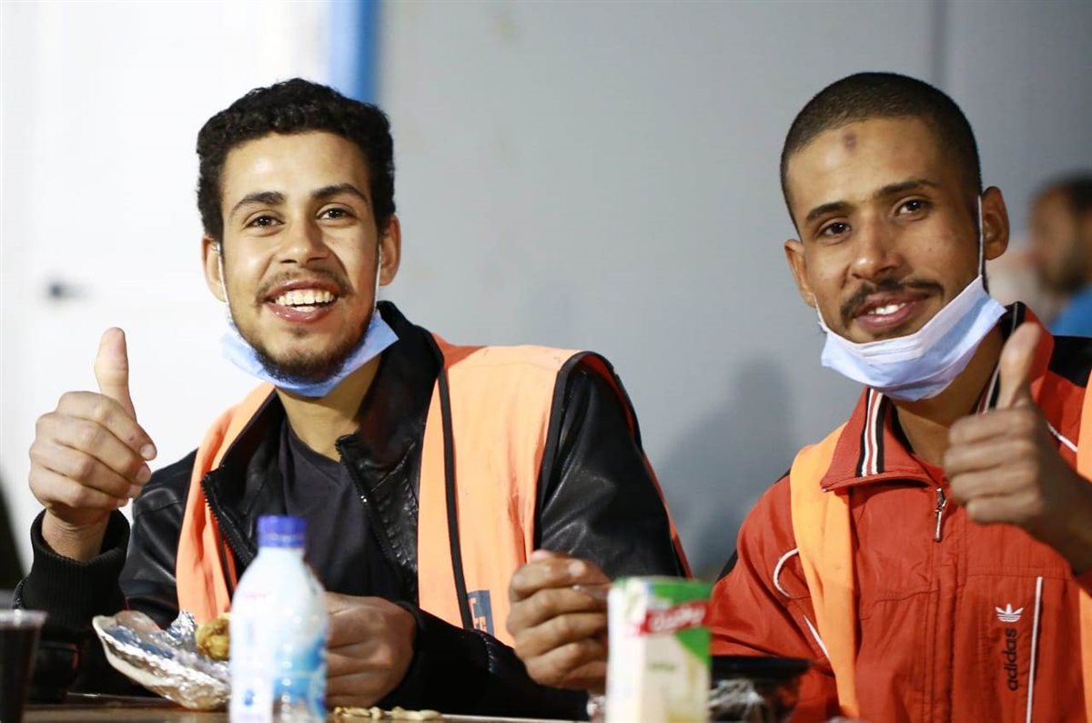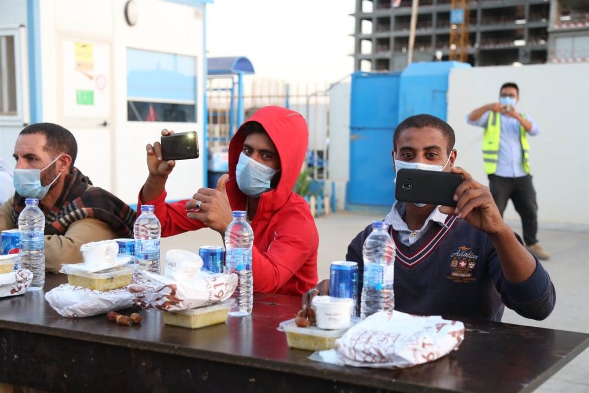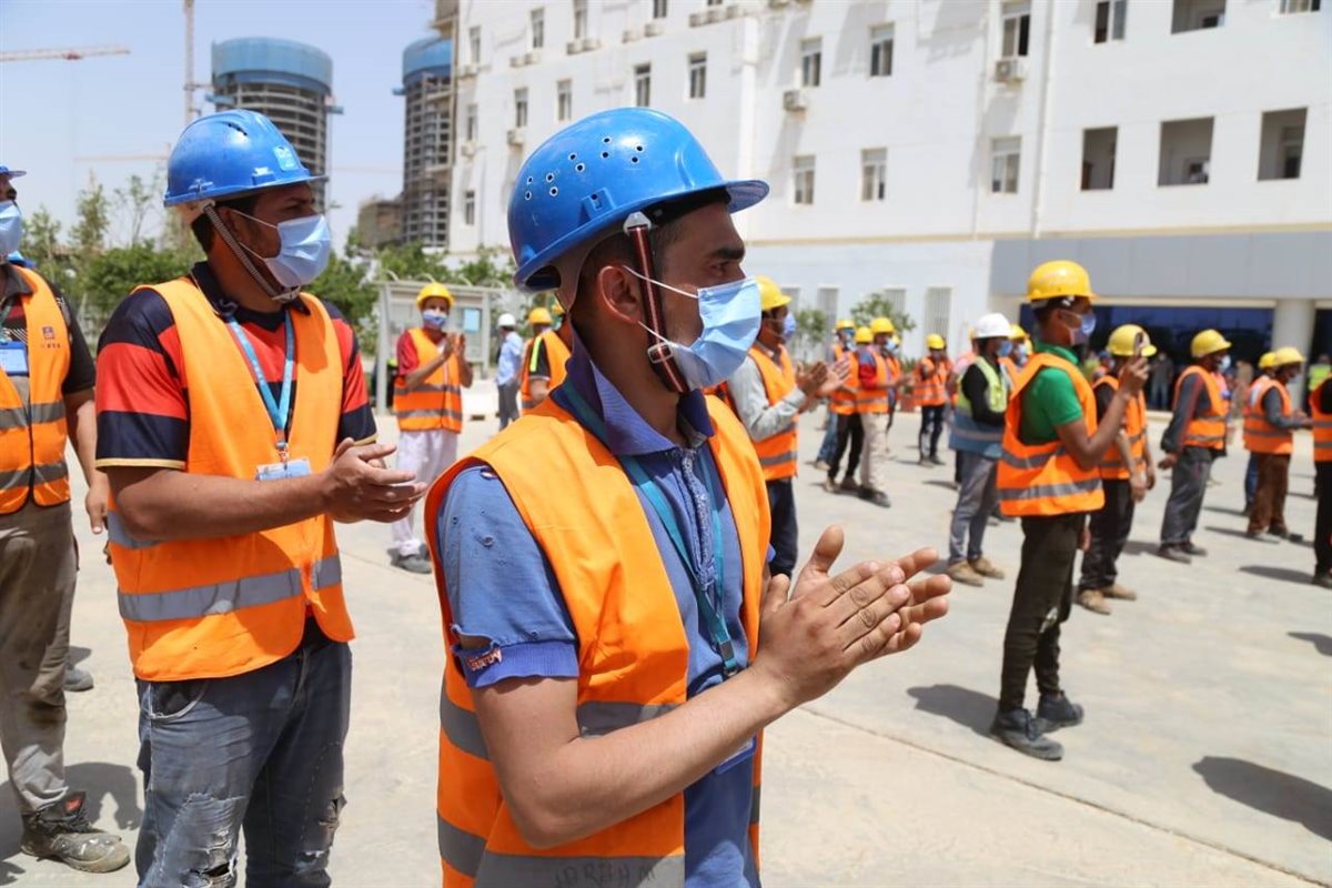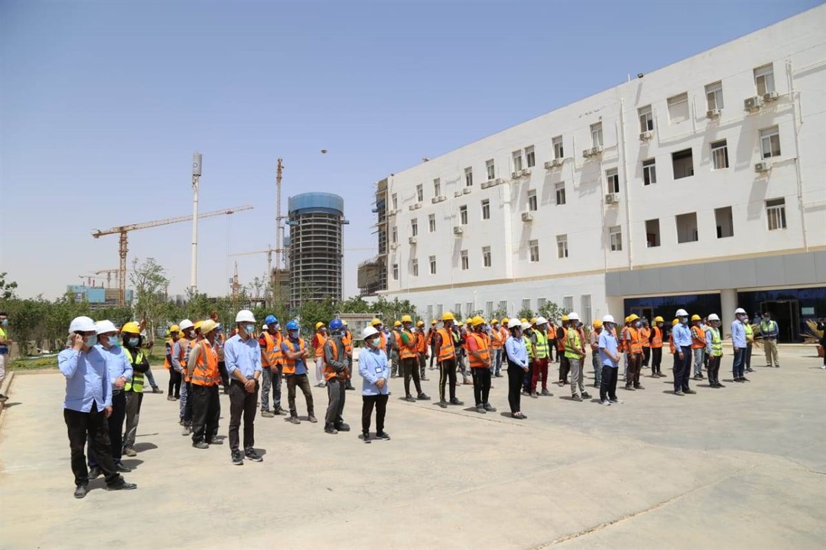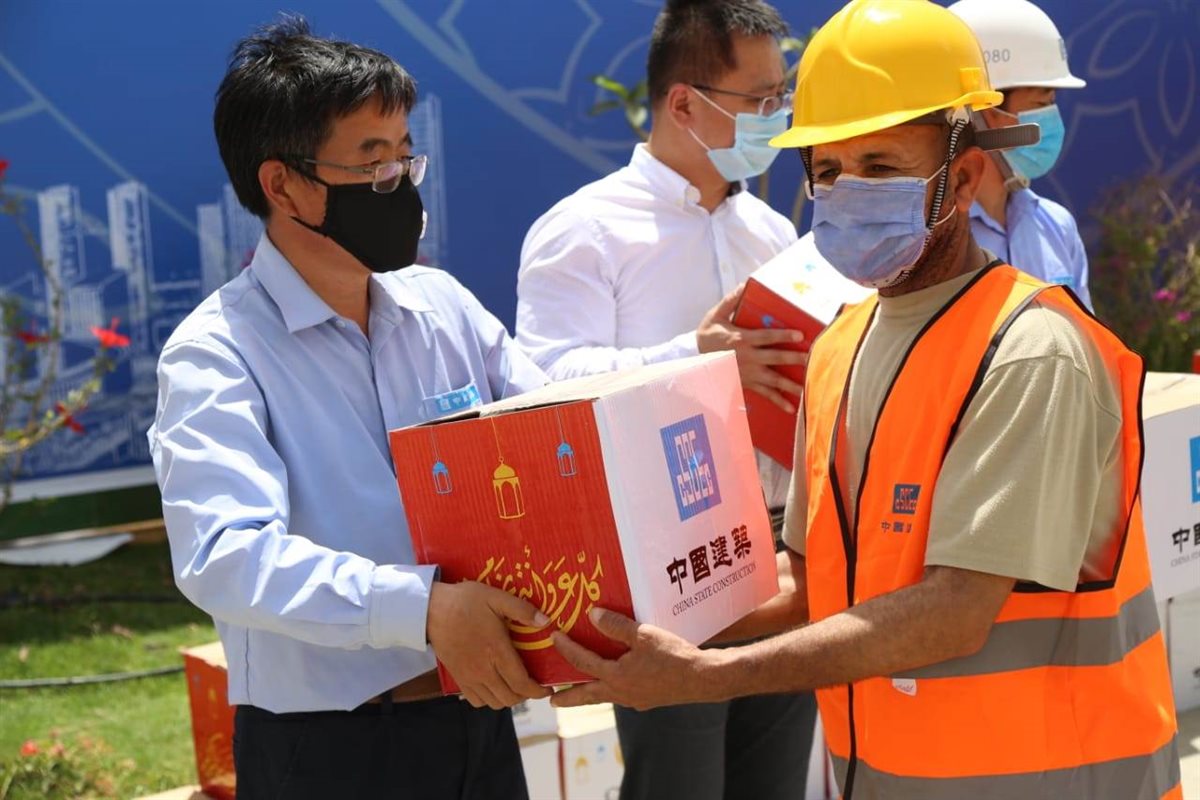 بالصور.."الصينية" المنفذة لأبراج العاصمة الإدارية توزع "كراتين " رمضان على العمال المصريين