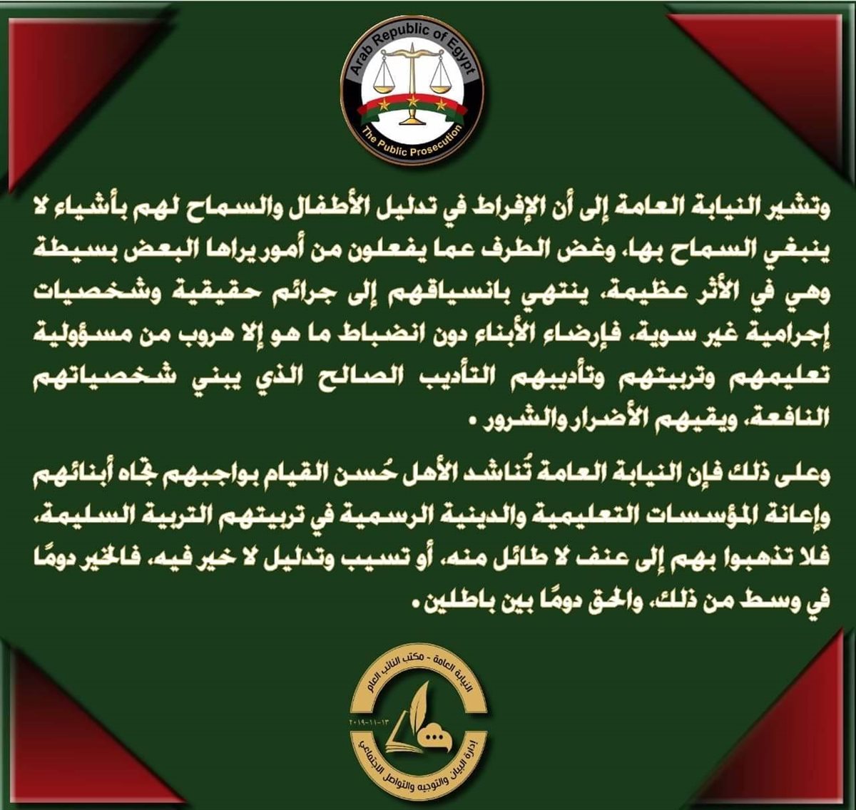 اشارت النيابة العامة الي ان الافراط في تدليل الاطفال والسماح لهم باشياء لا ينبغي السماح بها ، وغض الطرف عما يفعلون من أمور يراها البعض بسيطة وهي في الأثر عظيمة، ينتهي بانسياقهم إلى جرائم حقيقية وشخصيات إجرامية غير سوية، فإرضاء الأبناء دون انضباط ما هو إلا هروب من مسؤولية تعليمهم وتربيتهم وتأديبهم التأديب الصالح الذي يبني شخصياتهم النافعة، ويقيهم الأضرار والشرور.