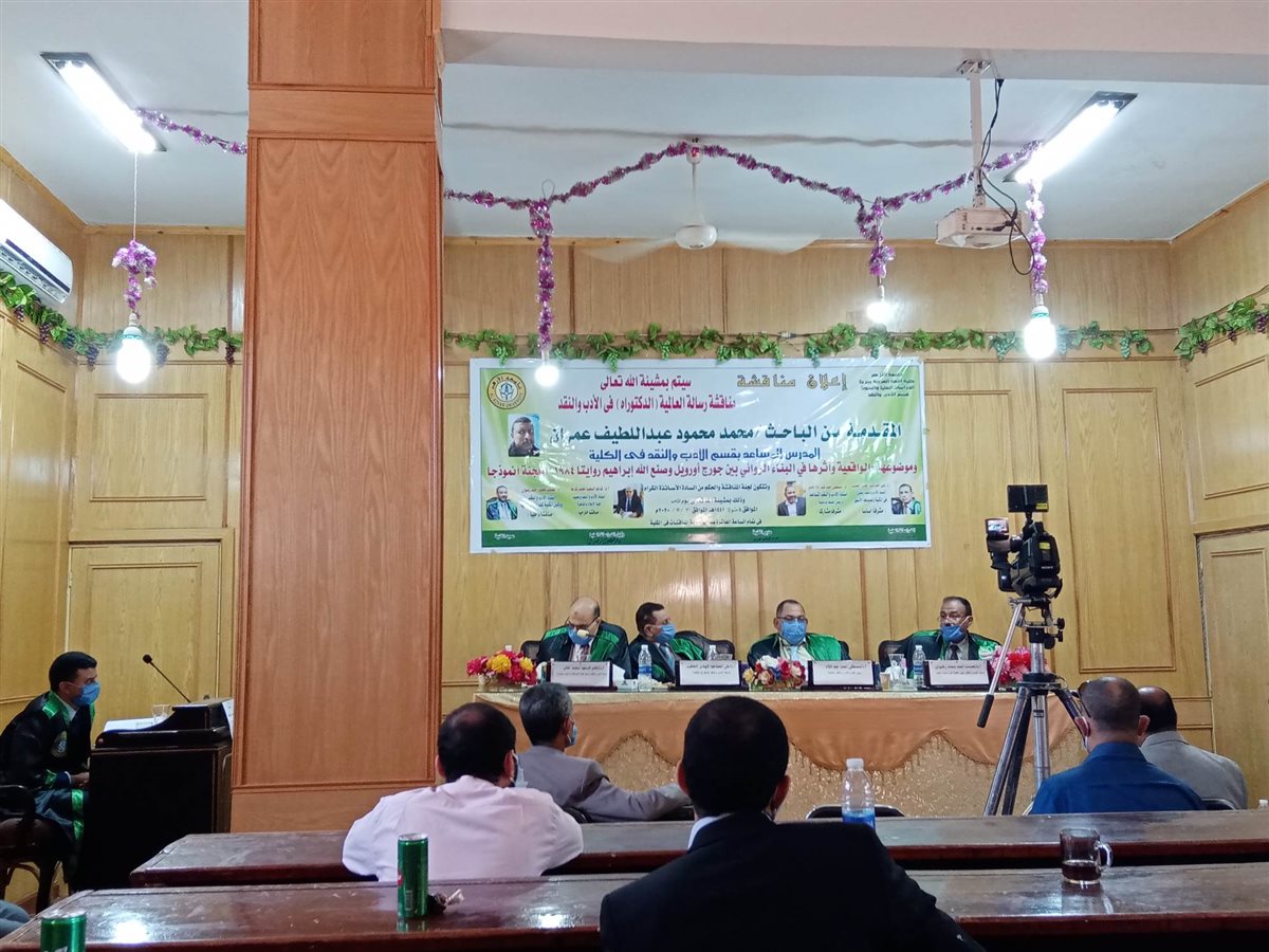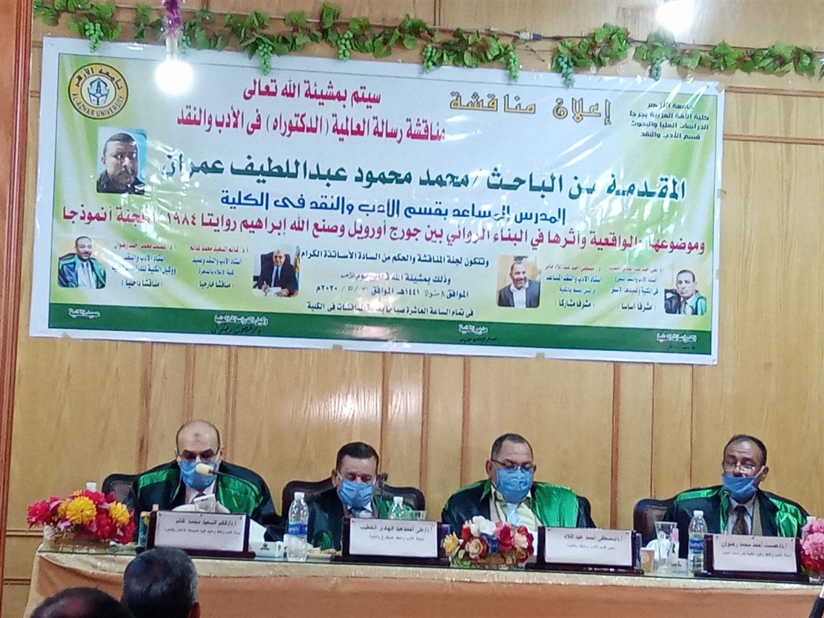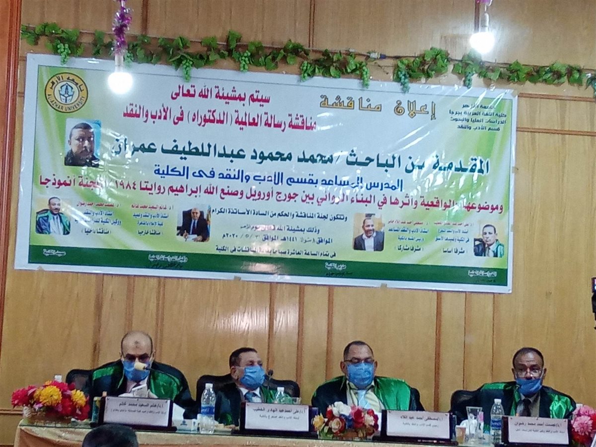 نوقشت بكلية اللغة العربية بجرجا فرع جامعة الأزهر باسيوط، بقاعة المناقشات بالكلية رساله العالمية "الدكتوراة" في الأدب والنقد المقدمة من الباحث محمد محمود عبداللطيف عمران، المدرس المساعد بقسم الأدب والنقد بكلية اللغة العربية بجرجا.