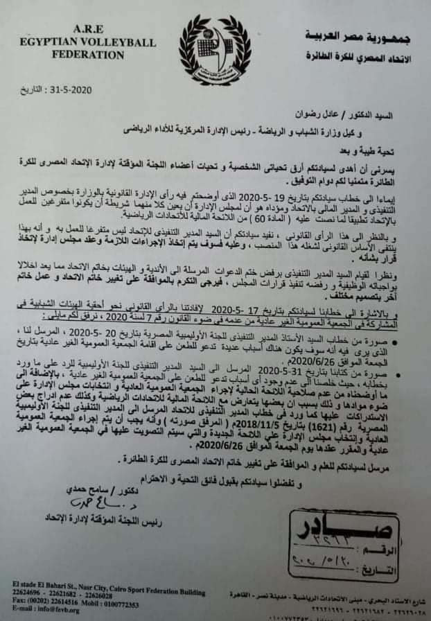 حيث أرسل سامح حمدى خطابا إلى عادل رضوان رئيس الإدارة المركزية للأداء الرياضى بوزارة الشباب والرياضة ، يطلب فيه السماح للجنة المؤقتة بإقالة المدير التنفيذى من منصبه لأنه غير متفرغ على غير الحقيقة ، لتعيين أحد رجال فؤاد عبد السلام بدلا منه للسيطرة على الاتحاد وذلك من خلال اجتماع مجلس الإدارة الذي سوف يعقد غد الأربعاء ، والإصرار على إقالته لأنه أخل بواجباته الوظيفية على حد قوله لعدم انصياعه لكلام أعضاء اللجنة لعقد الجمعية ومخالفة قرار اللجنة الأولمبية , وقانون الهيئات الشبابية رقم ٧ لسنة ٢٠٢٠ .