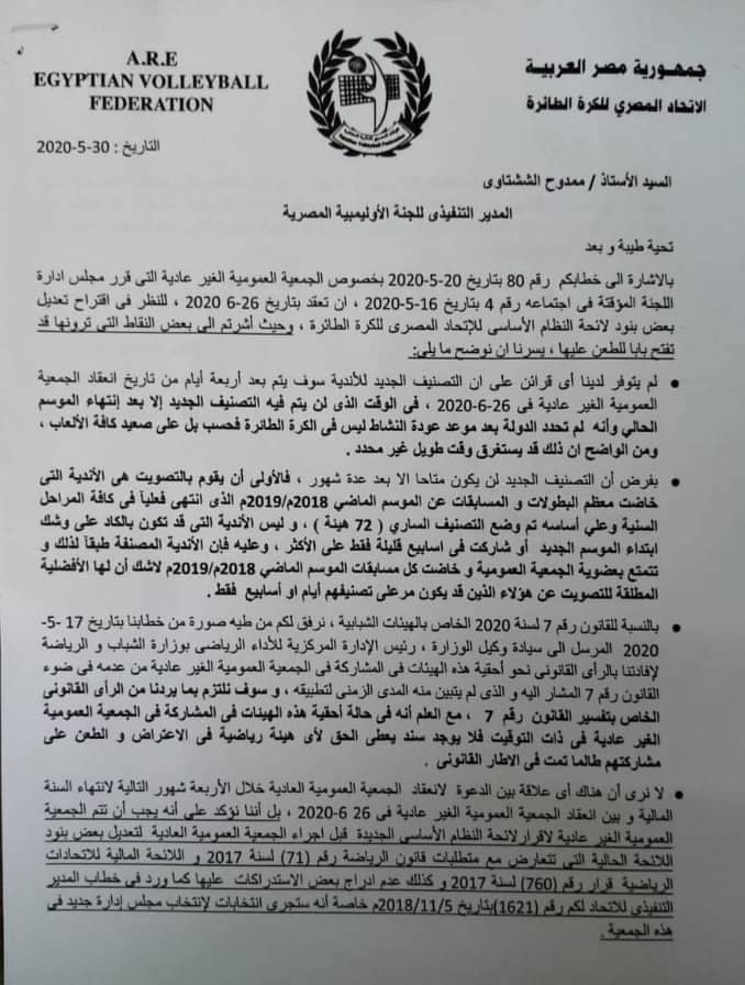 فى الوقت ذاته قامت اللجنة الأولمبية بإرسال خطاب شديد اللهجة ردا على ذلك إلى اللجنة المؤقتة بقيام الاتحاد بإرسال دعوات للأندية ومراكز الشباب أعضاء الجمعية العمومية فى التصنيف السابق لحضور الجمعية العمومية غير العادية التي تحدد موعدها ٢٦ يونيو ، رغم أن اللجنة الأولمبية أكدت أن الجمعية يشوبها البطلان ومع ذلك يصر حمدى على عقدها , حيث جاء فى الخطاب أنه لا يعقل أن يتولى وضع لائحة النظام الأساسى للاتحاد هيئات أنتهت مدتها ولم تعد ذات صفة ، وتطبق أحكام هذه اللائحة بعد ذلك على هيئات أخرى ، قامت بتحقيق النسبة المطلوبة للحصول على العضوية العاملة فى التصنيف الجديد ، والاوقع فى تلك الحالة هو الإسراع بتجهيز الهيئات العاملة فى الاتحاد للموسم القادم ، ليستطيعوا الإدلاء برأيهم فى تعديلات اللائحة التي سوف تطبق عليهم مستقبلا ، كما أن اللجنة الأولمبية لم تقم حتى هذه اللحظة بإصدار استمارات تفويض مندوبى الهيئات نظرا لعدم الإنتهاء من التصنيف الجديد للاتحاد طبقا لنص المادة ٩ من لائحة النظام الأساسى للاتحاد ، مما يشوب جميع إجراءات الجمعية البطلان .