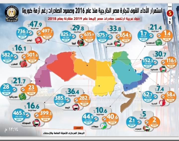 وعلى صعيد الدول العربية التي ارتفعت صادرات مصر إليها عام 2019، مقارنة بعام 2018، فقد جاء في الإنفوجراف، ارتفاع الصادرات المصرية إلى تونس بنسبة 47.9%، لتصل إلى 736.3 مليون دولار عام 2019، مقارنة بـ 497.7 مليون دولار عام 2018، والمغرب بنسبة 16.1%، لتصل إلى 582.6 مليون دولار عام 2019، مقارنة بـ 501.6 مليون دولار عام 2018، وموريتانيا بنسبة 21.7%، لتصل قيمتها إلى 28 مليون دولار عام 2019، مقارنة بـ 23 مليون دولار عام 2018، والسودان بنسبة 16.6%، لتصل قيمتها إلى 465.5 مليون دولار عام 2019، مقارنة بـ 399.3 مليون دولار عام 2018.