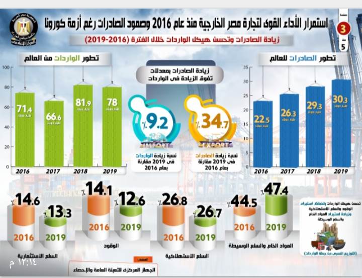 ورصد الإنفوجراف، زيادة الصادرات بمعدلات تفوق الزيادة في الواردات، لتصل نسبة زيادة قيمة الصادرات عام 2019 إلى 34,7%، مقارنة بعام 2016، في حين وصلت نسبة زيادة قيمة الواردات عام 2019، إلى 9.2%، مقارنة بعام 2016.