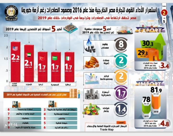 وأوضح الإنفوجراف، أن مصر قد حققت ارتفاعاً في الصادرات، وتراجعاً في الواردات خلال عام 2019، حيث ارتفعت الصادرات بنسبة 3,4%، لتصل إلى 30.3 مليار دولار خلال عام2019، مقارنة بـ 29.3 مليار دولار خلال عام 2018، في المقابل تراجعت الواردات بنسبة 4.8%، لتصل إلى 78 مليار دولار خلال عام 2019، مقارنة بـ 81.9 مليار دولار خلال عام 2018.