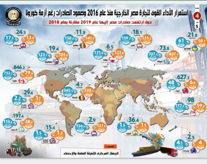 وفي هذا الصدد نشر المركز الإعلامي لمجلس الوزراء، إنفوجرافاً سلط من خلاله الضوء على استمرار الأداء القوي لتجارة مصر الخارجية منذ عام 2016، مع صمود الصادرات رغم أزمة كورونا.