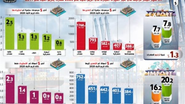 في المقابل وبشأن أكبر 5 مجموعات سلعية تم استيرادها خلال الربع الأول من عام 2020، جاء في الإنفوجراف، أنه تم استيراد وقود معدني بقيمة 2.5 مليار دولار، وكذلك استيراد آلات ومعدات بقيمة 1.3 مليار دولار، فضلاً عن استيراد حبوب بقيمة 1.3 مليار دولار، بجانب استيراد أجهزة كهربائية بقيمة 1.2 مليار دولار، وأخيراً استيراد حديد وصلب بقيمة 0.8 مليار دولار.