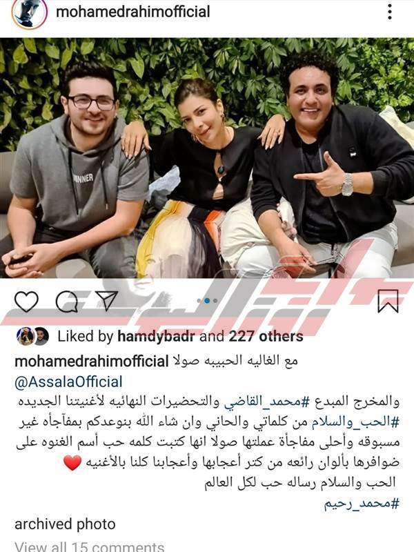 وعلى الجانب ألاخر نشر الملحن محمد رحيم على صفحته مجموعة من الصور التي تجمعه مع آصاله ،وكتب "رحيم" تعليقًا على الصور عبر تطبيق "إنستجرام": "مع الغالية الحبيبة صولا، والمخرج المبدع محمد القاضي، والتحضيرات النهائية لأغنيتنا الجديدة (الحب والسلام)، من كلماتي وألحاني، وإن شاء الله بنوعدكم بمفاجأة غير مسبوقة"