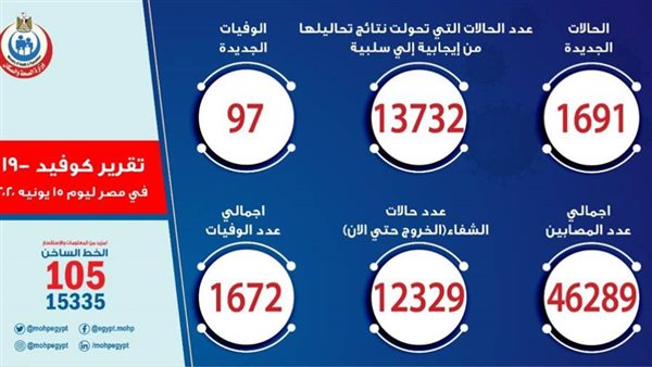 وذكر أن إجمالي العدد الذي تم تسجيله في مصر بفيروس كورونا المستجد حتى اليوم الاثنين، هو 46289 حالة من ضمنهم 12329 حالة تم شفاؤها وخرجت من مستشفيات العزل والحجر الصحي، و 1672 حالة وفاة.