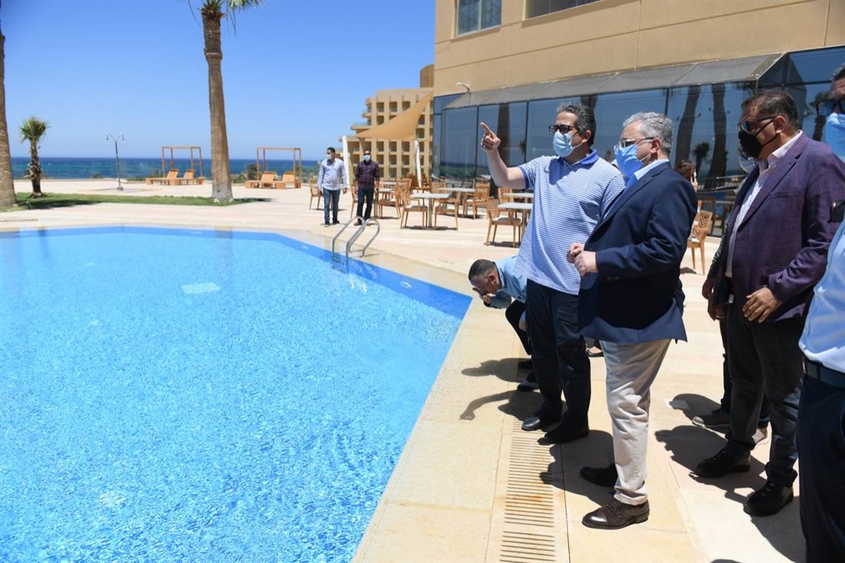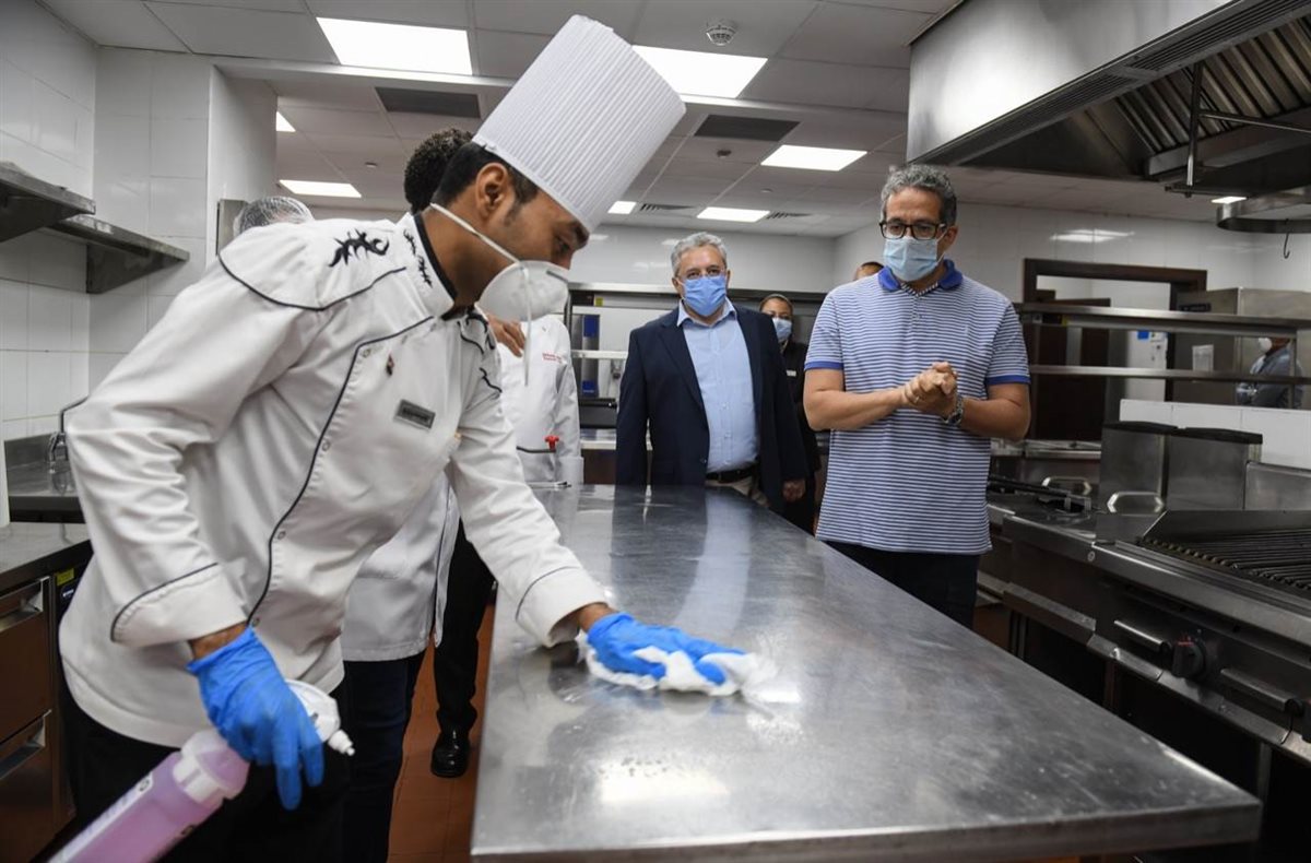 وخلال الجولة قام الدكتور خالد العناني بتفقد الإجراءات الوقائية التي تتبعها هذه الفنادق منذ دخول الضيف من باب الفندق وإجراءات تطهير الأمتعة وقياس درجات حرارة الضيوف وتطهير اليدين، ومنطقة الاستقبال والبهو وإجراءات التسكين ومنطقة المطاعم والمطابخ والبرجولات وحمامات السباحة، والممرات الداخلية والممشى الخارجي ومنطقة الشاطئ.