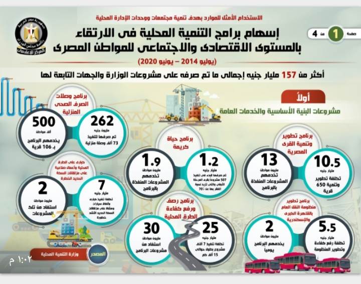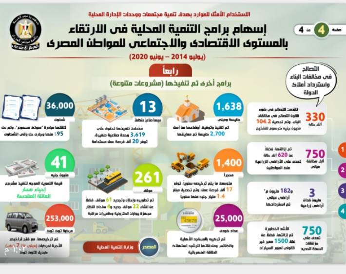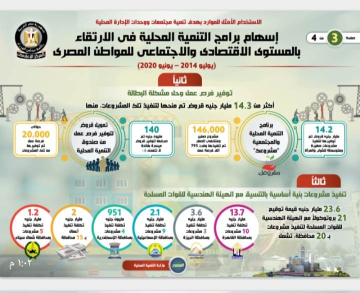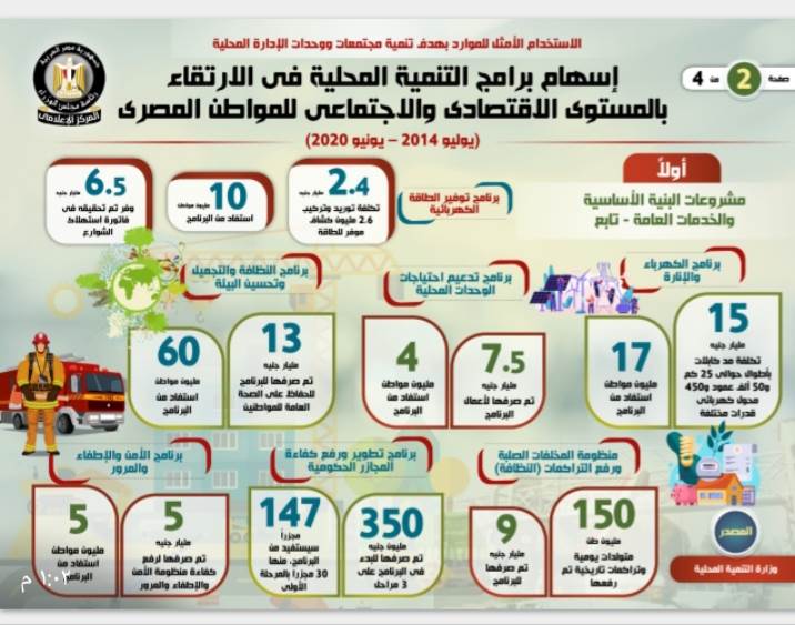 وقد نشر المركز الإعلامي لمجلس الوزراء، إنفوجرافاً سلط من خلاله الضوء على مدى مساهمة برامج التنمية المحلية في الارتقاء بالمستوى الاقتصادي والاجتماعي للمواطن المصري والاستخدام الأمثل للموارد بهدف تنمية مجتمعات ووحدات الإدارة المحلية وذلك خلال الفترة من يوليو 2014 حتى يونيو 2020.